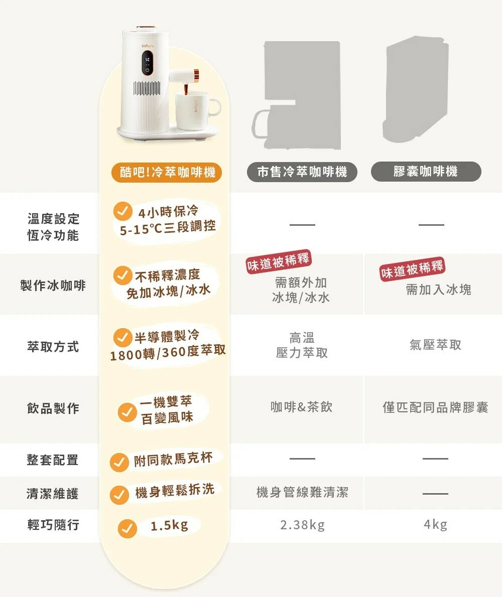 採用法國半導體製冷黑科技,品質安全又穩定。實現無須加冰塊冰水,也可以輕鬆製作冷萃咖啡、冷萃茶。