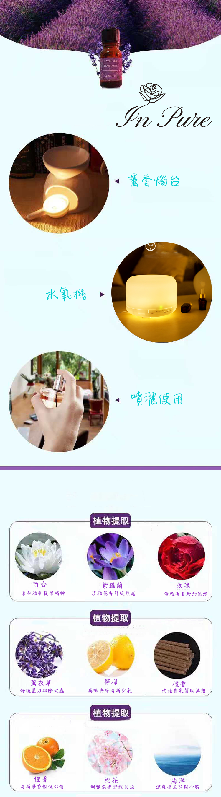 ◉精油香味:櫻花、檀香、百合、玫瑰、紫羅蘭、海洋、檸檬、茉莉、綠茶、橙花、鼠尾草、百里香、海風、薰衣草、乳香、香茅、風信子、小蒼蘭