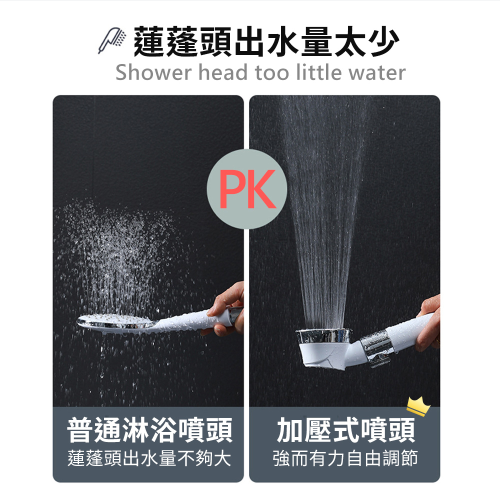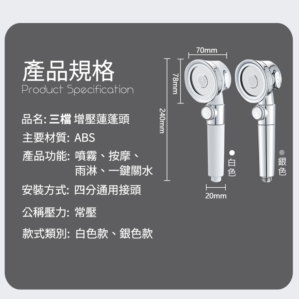 產品功能: 噴霧、按摩、雨淋、一鍵關水